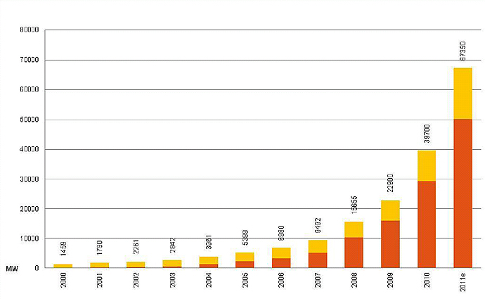 Sam razvoj kapaciteta fotonaponskih sustava od 2000. do 2011. godine prikazan je na Slici 2. Naran?astom bojom ozna?eni su kapaciteti u Europi, a žutom bojom ostatak svijeta.